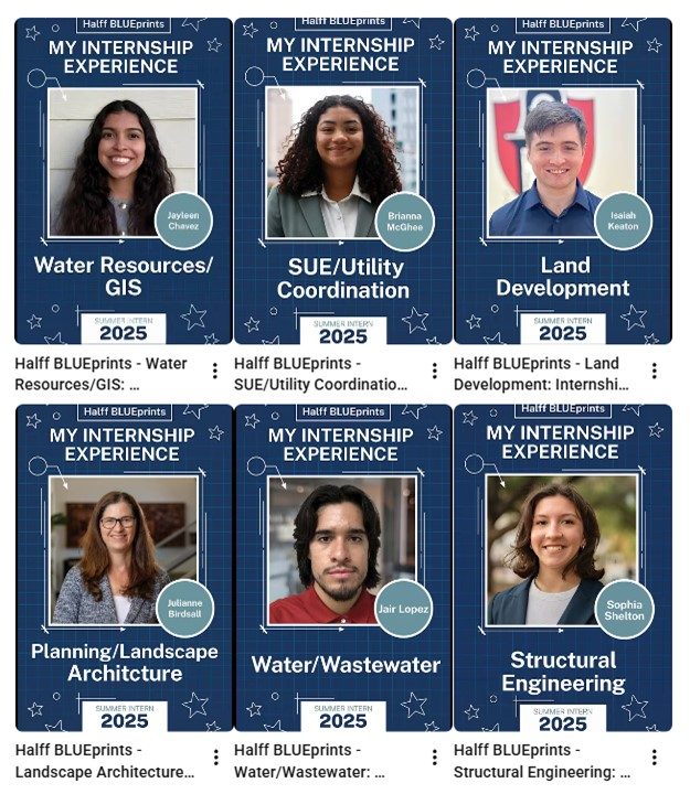 Through Halff’s BLUEprints Intern Spotlight Series, hear directly from interns as they share their experiences working on real projects, collaborating with mentors and exploring different career paths. The video series features interns from a range of practices, offering an inside look at day-to-day work and professional growth.