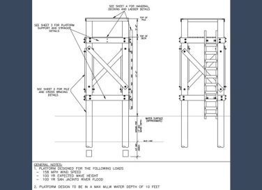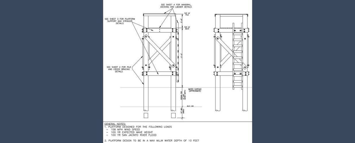 Using the hydraulic data and the site-specific geotechnical report, Halff completed structural engineering for the platform, analyzing all structural members and determining required pile embedment depths for lateral and vertical loading. The design followed ASCE 7 and USACE wave loading criteria and used the 100-year Atlas 14 storm event for the San Jacinto River. Halff coordinated with the geotechnical engineer as needed and developed the timber specifications for inclusion in the construction package. The project concluded with the delivery of sealed structural plans and timber specifications for the new platform.